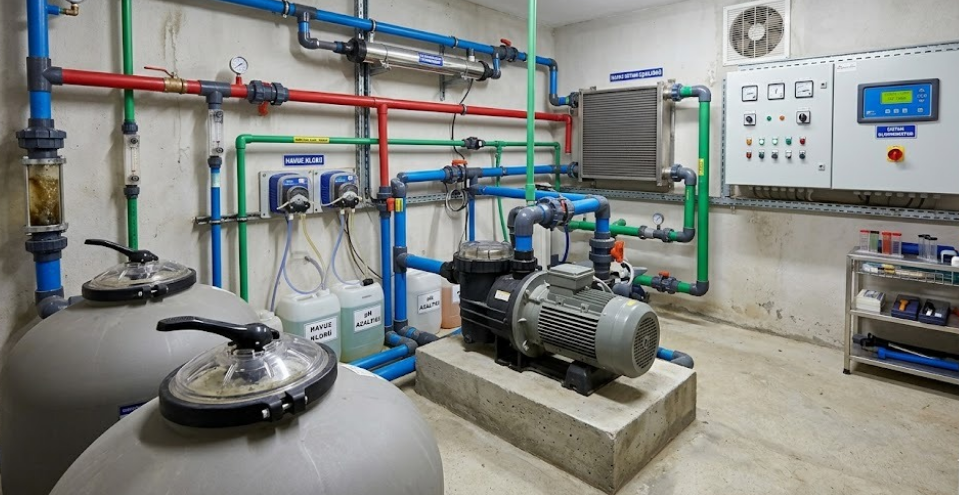 Havuzun su sirkülasyonunu, filtrasyonunu ve dezenfeksiyonunu sağlayan tüm teknik ekipmanların (pompa, filtre, vana, kontrol panosu vb.) periyodik olarak kontrol edilmesi, temizlenmesi ve onarılması işlemidir. Amacı, sistemin kesintisiz ve verimli çalışmasını sağlamaktır.
